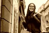 Asian woman using smartphone and looking away while enjoying a day shopping