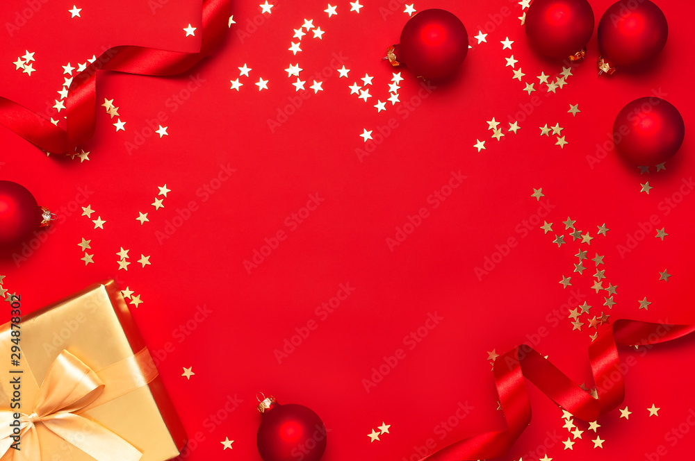 New Year Christmas golden presents with ribbon, Christmas balls, gold confetti stars on red background top view. Flat lay Xmas holiday 2020 celebration. Gift boxes greeting card Festive decorations