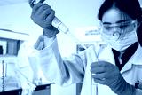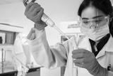 Interior of clean modern white medical or chemistry laboratory background. Scientist working at a lab with micro pipette and test tube. Laboratory concept with Asian woman chemist.