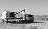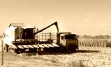 harvesting corn with a combine in season and unloading grain into a truck, agricultural process