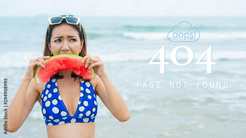Error 404 page not found web page.Beautiful asian girls in bikini can't eat watermelon on the beach.oops and page not found text message.