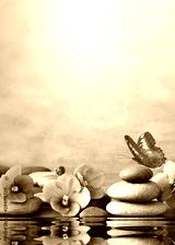 Beautiful flower, butterfly and stone zen spa on grey background.