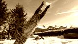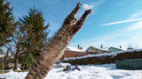 CLOSE UP, DOF: Furry cat jumps and catches a snowball with its front paws.