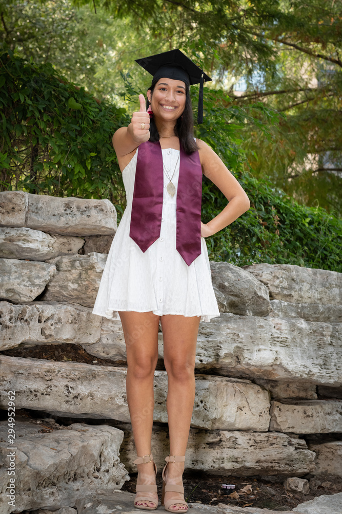 Young beautiful college girl graduating in her cap and gown