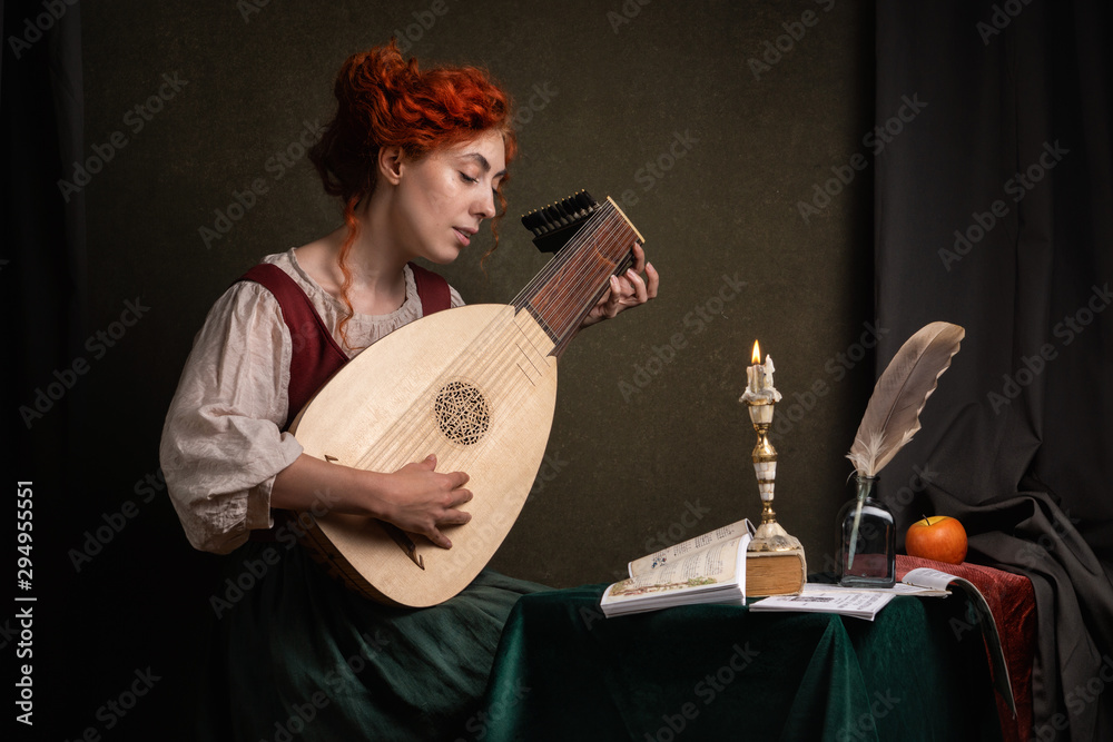 Red-haired girl in a historical suit plays the lute. Renaissance painting style.....