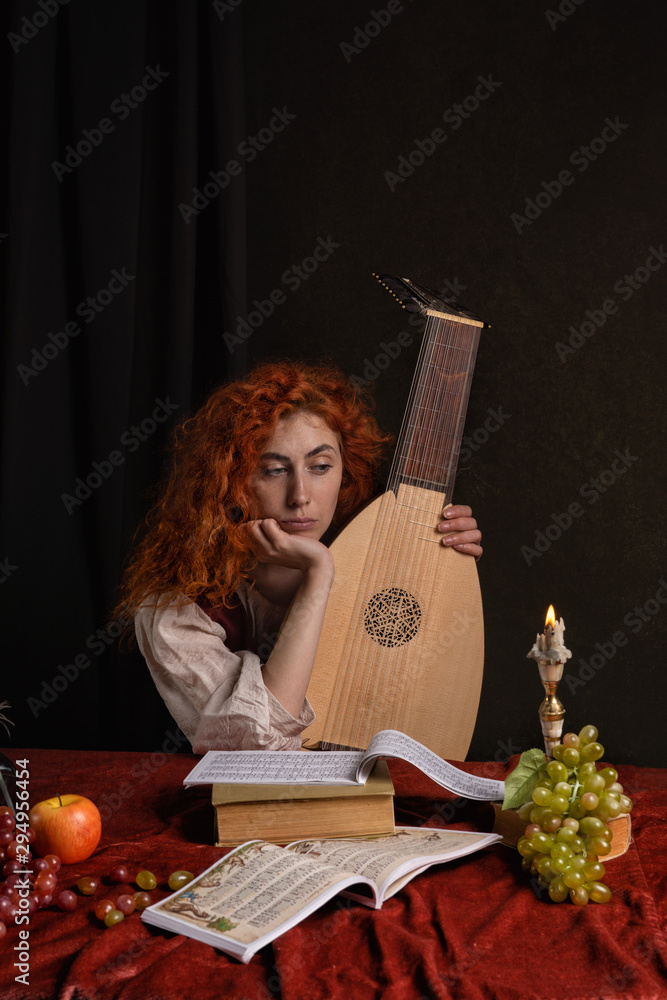 Red-haired girl in a historical suit plays the lute. Renaissance painting style.....