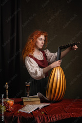 Red-haired girl in a historical suit plays the lute. Renaissance painting style.....