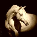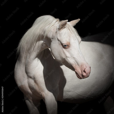 Portrait of a beautiful white horse looks back on black background isolated