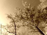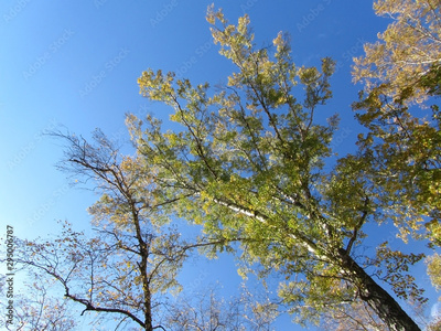 Trees on a background of blue sky in autumn. Late fall. Almost all of the leaves fell from the trees. Autumn sunny day.