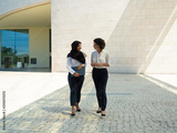 Diverse female business colleagues chatting, while going outside. Young Muslim businesswoman walking from office building, holding folder and talking to colleague. Communication concept