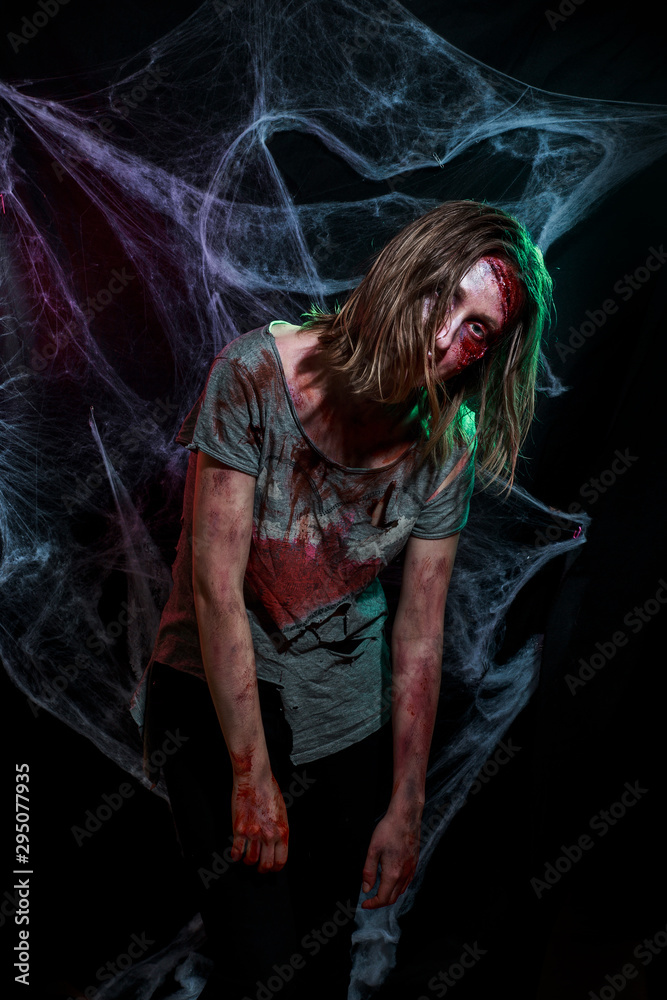 portrait of horrible zombie woman with wounds. Horror. Halloween make-up and costume