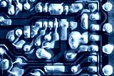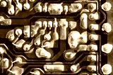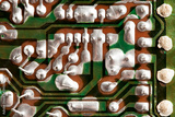 Retro circuit board close-up. Green electronic chip soldering paths and trace. Shallow depth of field photo