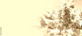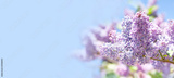 Springtime holidays greeting card template. Common lilac blooming purple flowers on blue sky background. Copy space