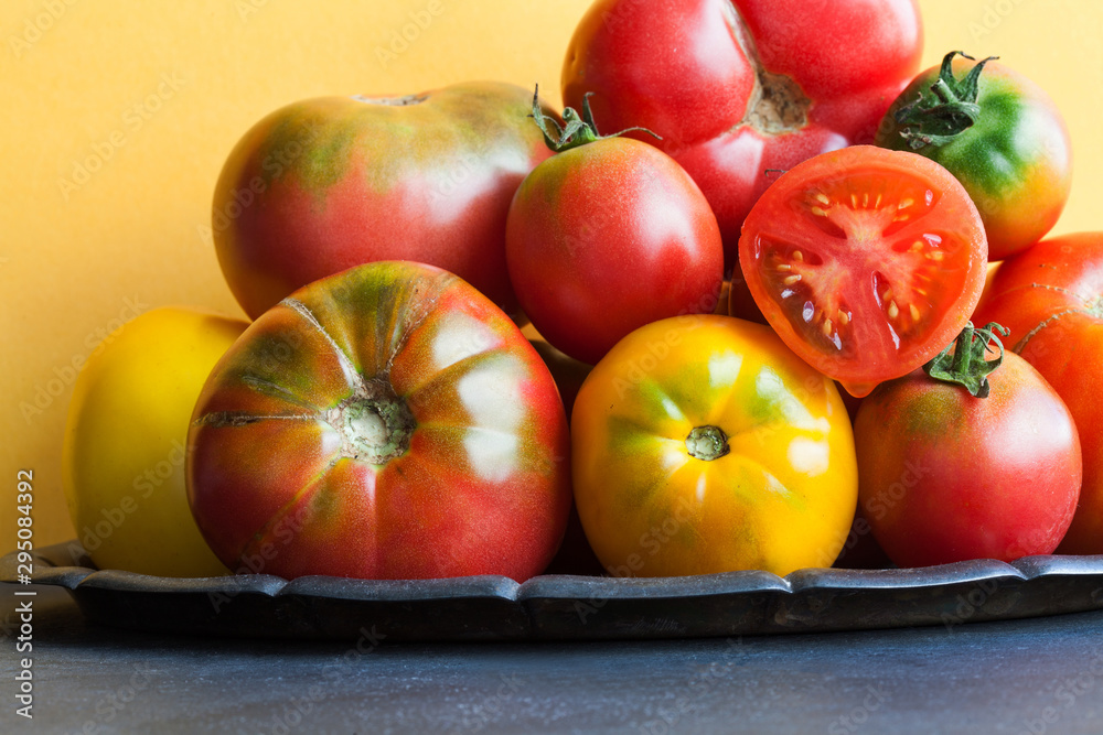 Organic vegetables harvest. Fresh ripe organic tomatoes on a tray. Variety tomato vegetables, different size red yellow pink green color.