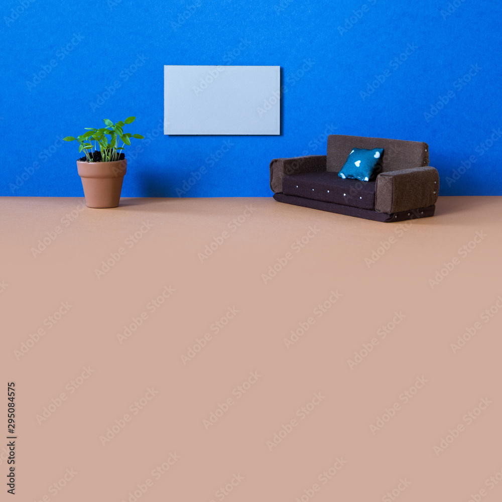 Mock up photo frame on the blue wall. Modern living room interior with sofa flowerpot and blank poster. copy space brown floor background. simplicity concept