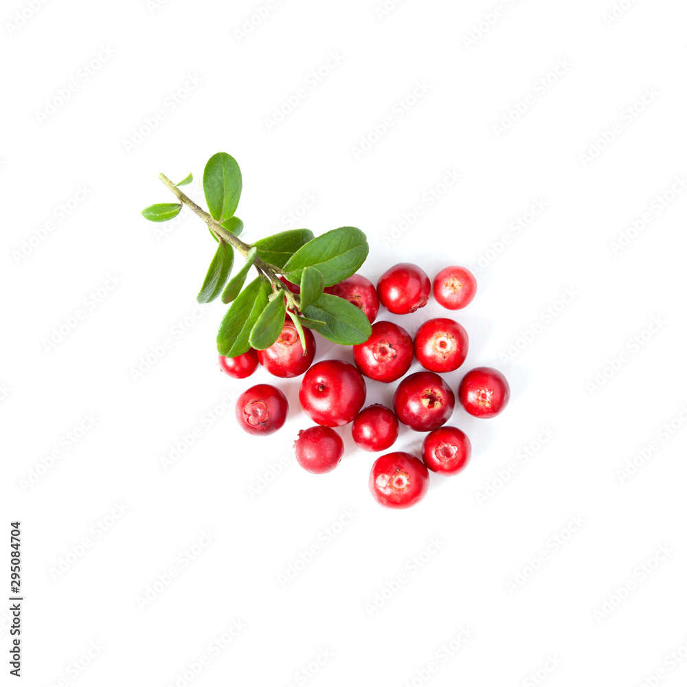 Wild cowberry isolated on white background. Ripe red forest berries Vaccinium vitis-idaea with green leaves.