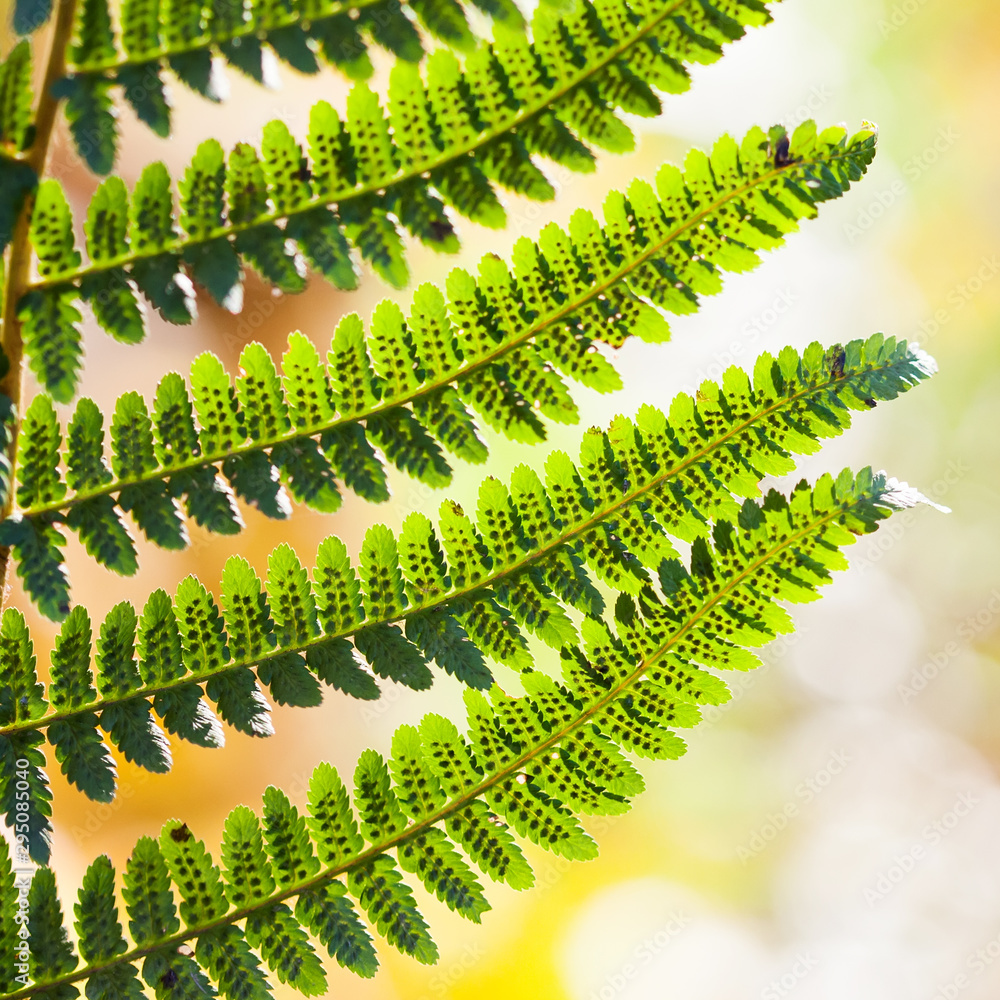 Green fern leaves on soft background. Forest plant Dryopteris filix-mas macro view. Selective focus.