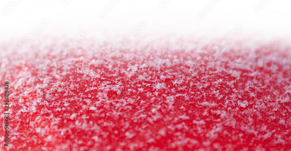 Real snow flakes on a red surface. Festive Christmas backdrop with snow closeup. White background, shallow depth of field