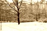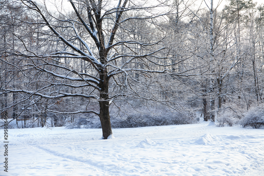 Winter forest with a large snowy tree. January landscape cold weather gray day background