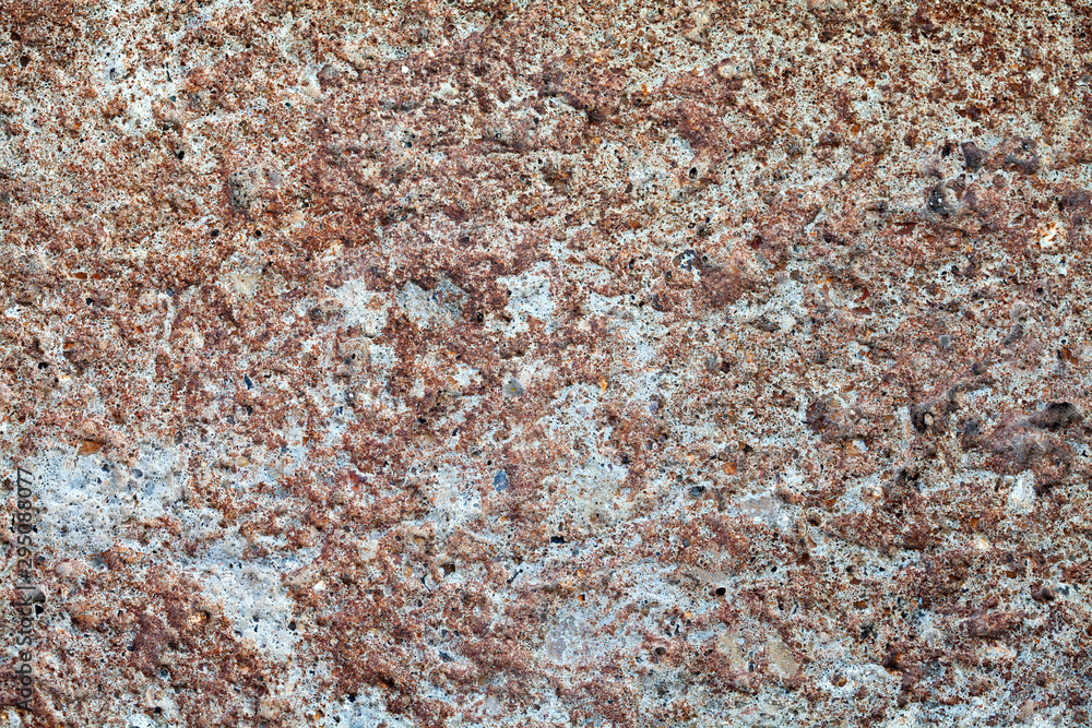 Aged rough stone wall textured background. Old facade surface grungy pattern closeup.