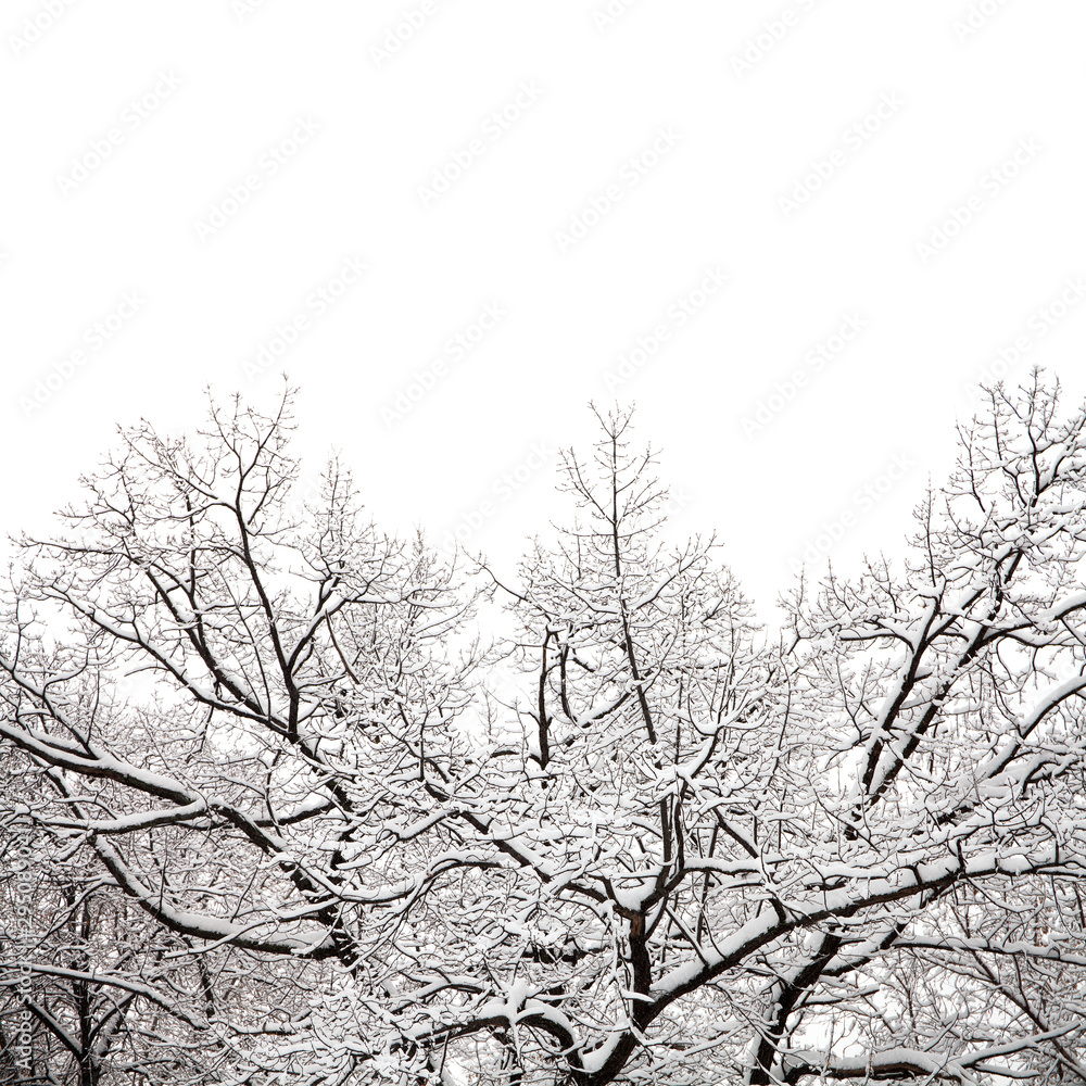 Snow covered big tree branches on white background. Winter holidays festive greeting card template. copy space