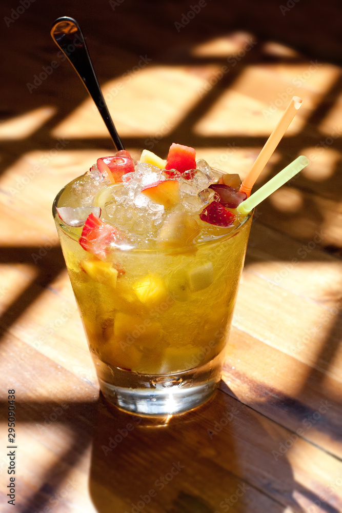 Cobbler refreshing alcoholic cocktail with fruits. Summer party cold drink on a wooden table, sun lights. selective focus