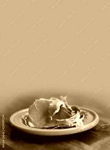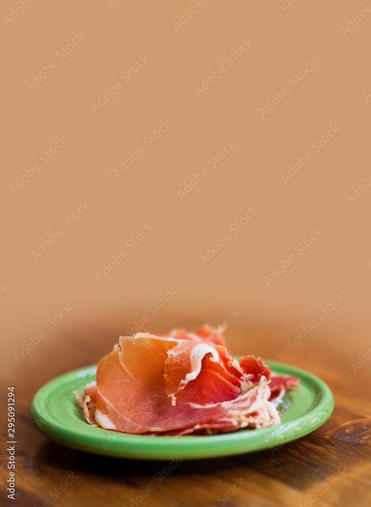 Traditional tapas Jamon in a green plate. Spanish cuisine dish slices of raw pork meat. Close-up photo, soft focus, brown blurred abstract background. copy space