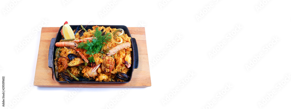 Paella Marinera in a pan on a cutting board. A classic dish of Spanish cuisine seafood rice with prawn mussels cooked in fish broth. white background, copy space