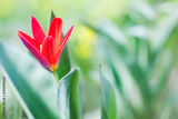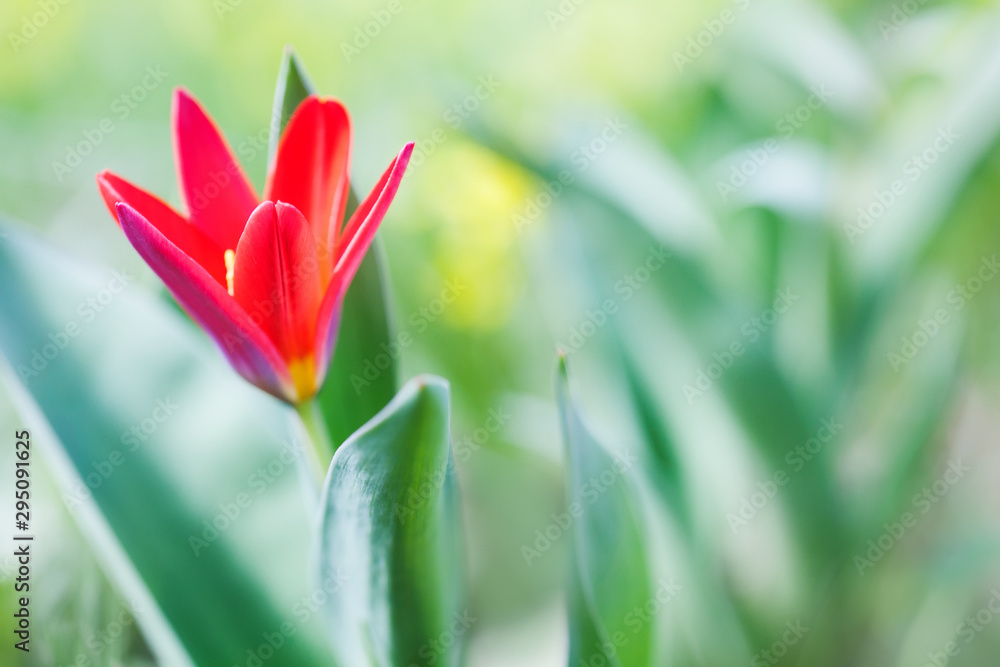 Red tulip flower on blurred green background. macro view shallow depth of field. copy space