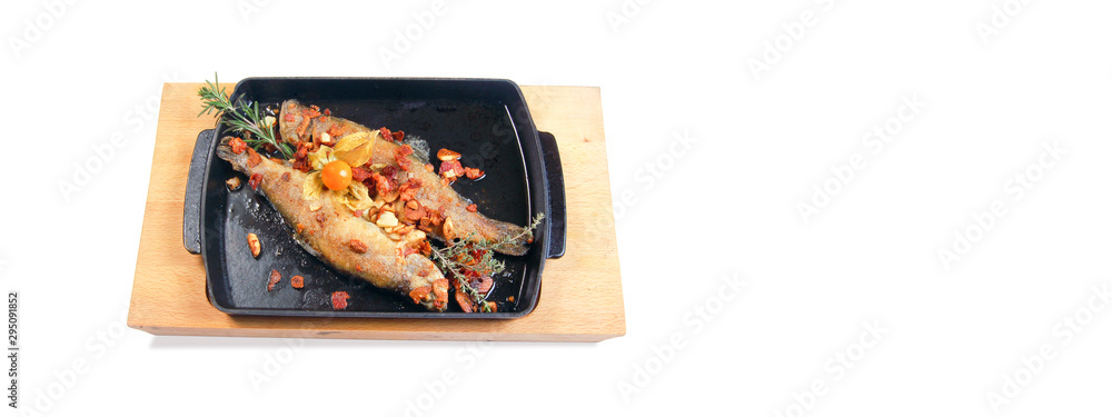 Fried trout with garlic and rosemary. Two trouts in a baking pan. white background, copy space