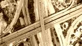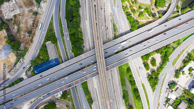 Rail track and conductor rail top view, Road Expressway traffic an important infrastructure with moving cars and railway tracks on which the train rides in Bangkok Thailand.