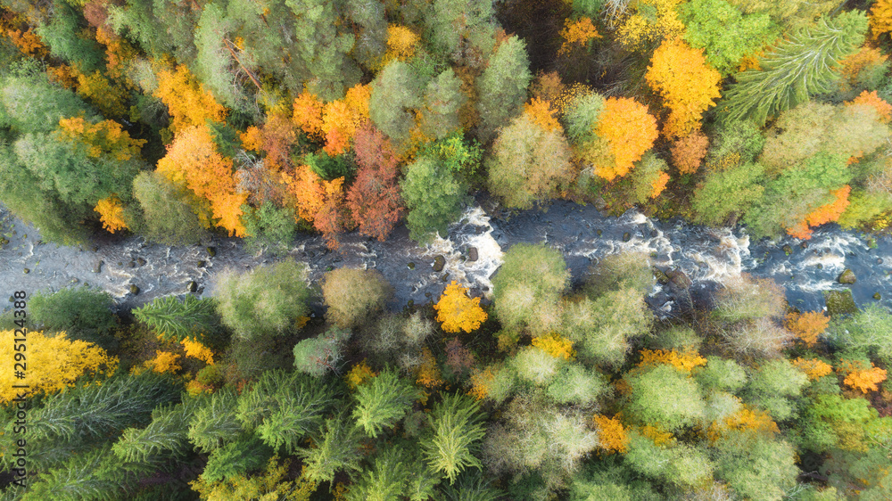 Beautiful autumn forest with yellow and red trees, blue mountain river, aerial top view.