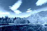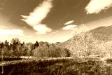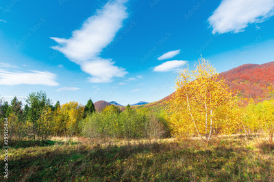 wonderful landscape in autumn. birch trees in yellow foliage. distant mountain in fall colors. sunny weather with fluffy clouds on the blue sky