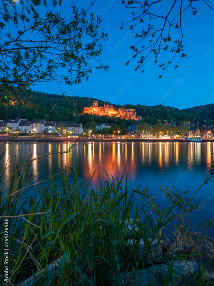 Old town of Heidelberg along the Neckar river with the castle ruins illuminated at night