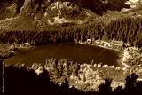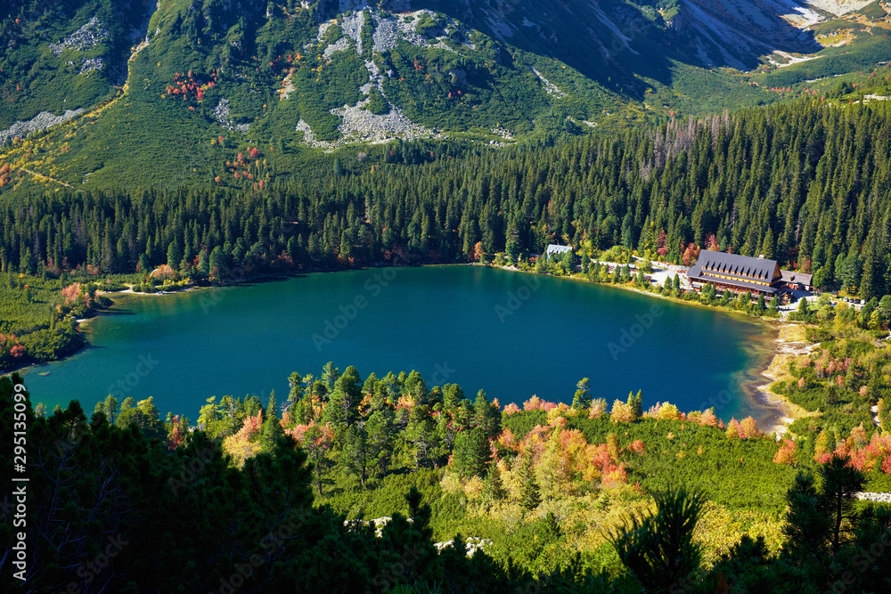 Poprad lake among peaks and autumn forests in High Tatras mountains, Slovakia