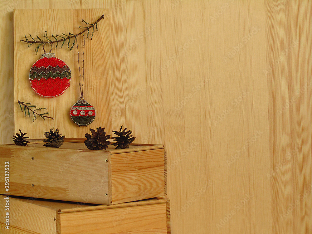 Christmas tree branches with red balls. Christmas crafts and boxes with gifts or toys on a wooden background. New Year or Christmas concept. Copy space.