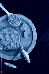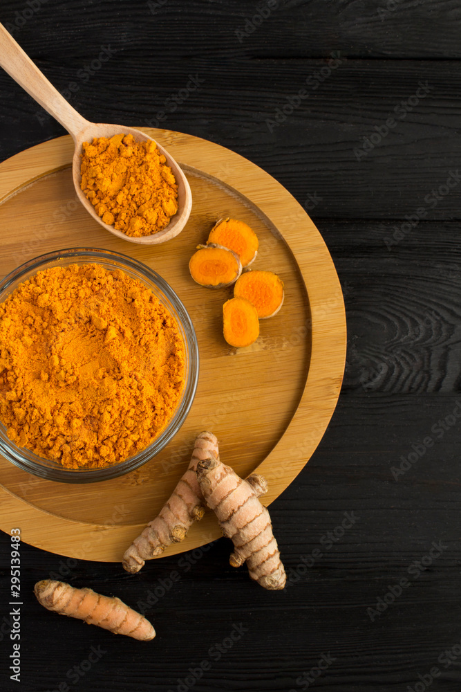 Turmeric powder in the glass bowl on the brown kitchen board on the black wooden background. Top view. Copy space. Location vertical.
