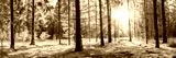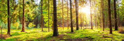 Beautiful, green forest with moss-covered soil and bright sun shining through the trees