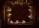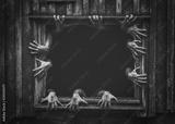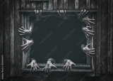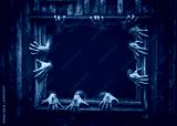 Hands rising out from the old window ancient house, Halloween concept. Increased noise and grain effect.