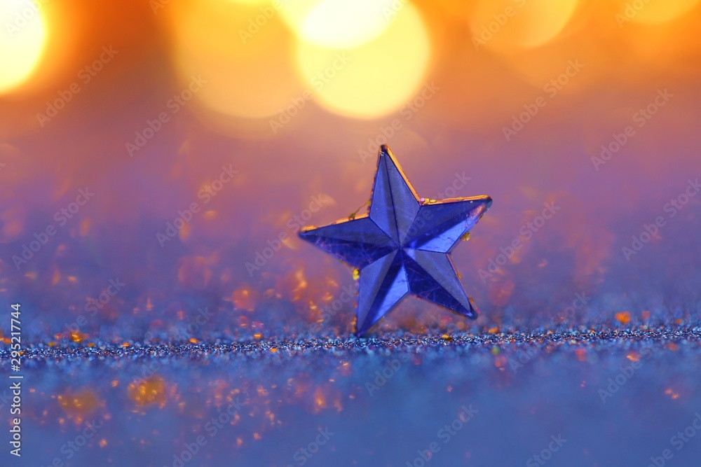 Christmas and New Year background.Winter holidays wallpaper.Blue star macro on a blue glitter background with orange bokeh.Festive shiny background