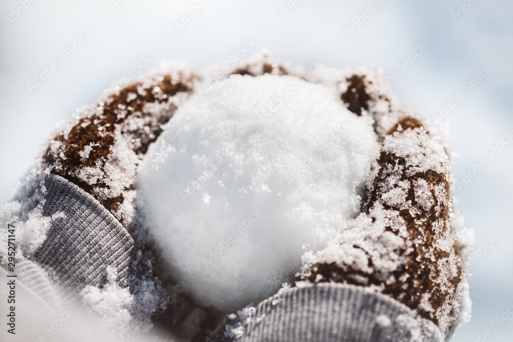 Hände voller Schnee halten einen Schneeball, Konzept Winter und Schneeballschlacht