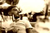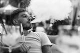 Handsome guy exhales hookah smoke. Young man smoking a fragrant oriental hookah outside. Rest with hookah and cocktails on summer area.