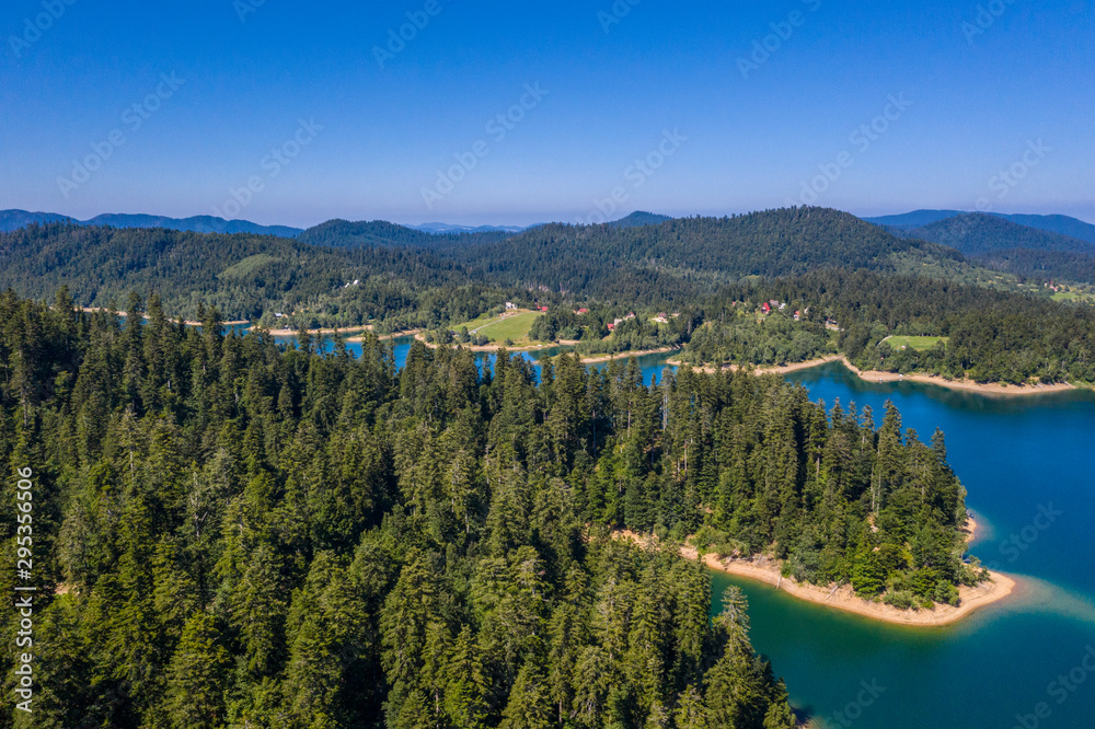 Aerial panoramic view of Lokvarsko Lake, beautiful mountain landscape on sunny summer day, Lokve, Gorski kotar, Croatia