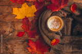 Autumn, fall leaves, hot cup of coffee and a warm wool scarf on wooden table background top view. Seasonal, morning coffee. Hot drink for autumn cold rainy days.