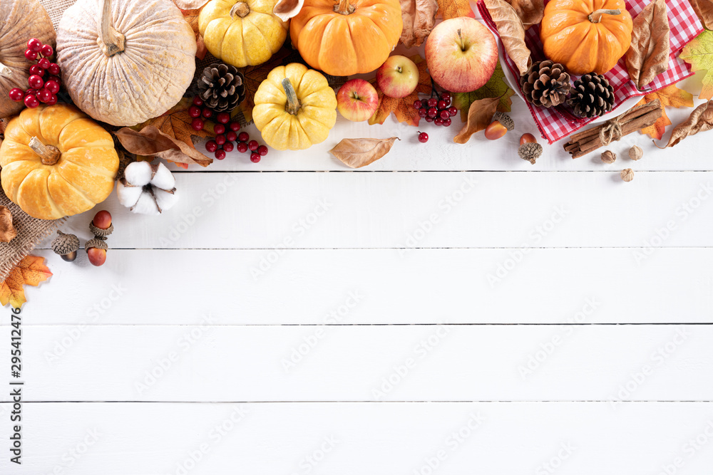 Top view of Autumn maple leaves with Pumpkin and red berries on white wooden background. Thanksgiving day concept.