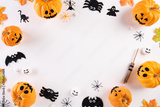 Top view of Halloween crafts, orange pumpkin, ghost, bat and spider on white background with copy space for text. halloween concept.