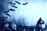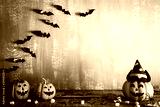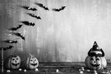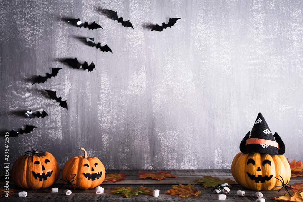 Orange ghost pumpkins with witch hat on gray wooden board background with bat. halloween concept.