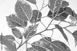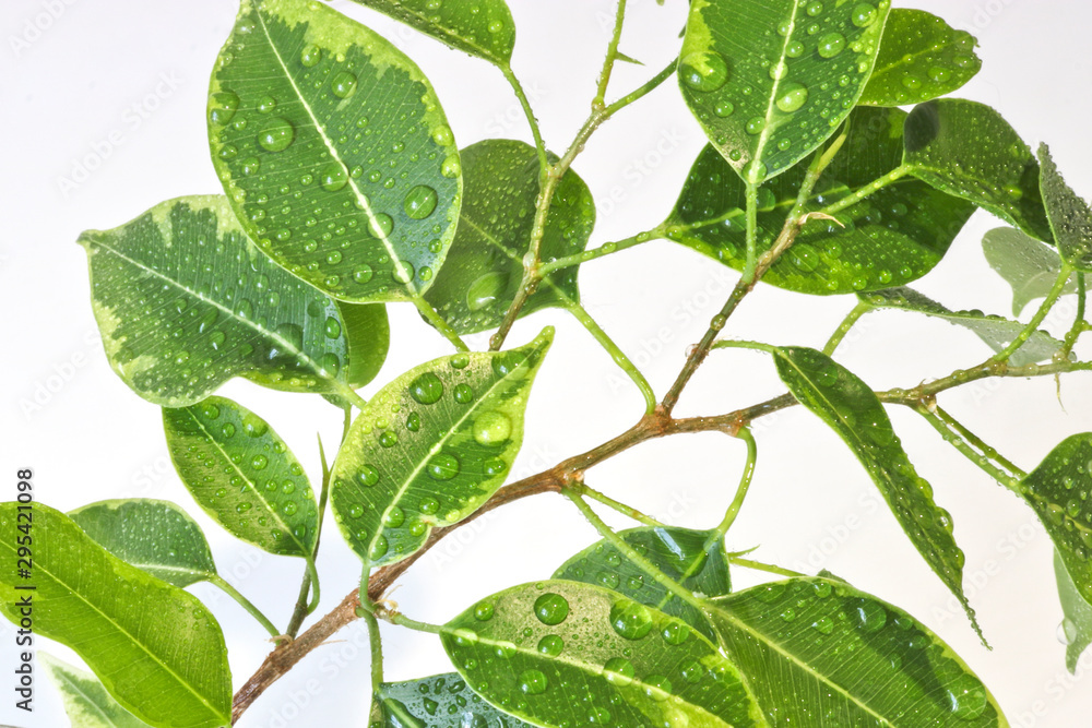 Leaves of ficus benjamin with large drops of water. Close-up. Natural background.