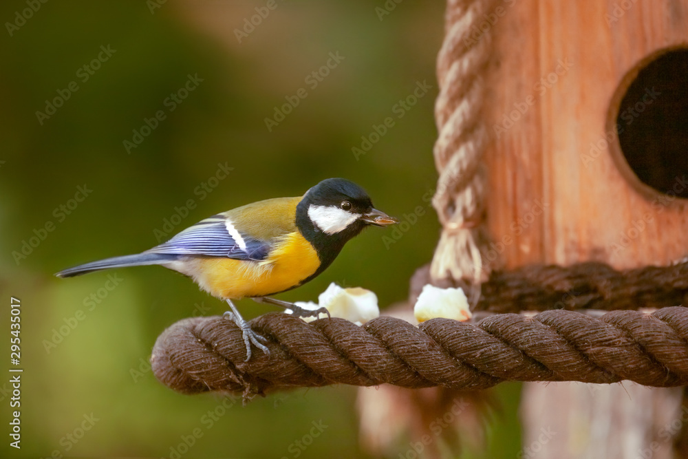 titmouse on a birdhouse eats seeds, close-up, daylight, songbirds in the wild