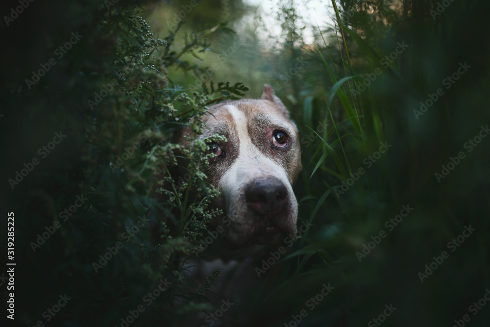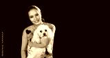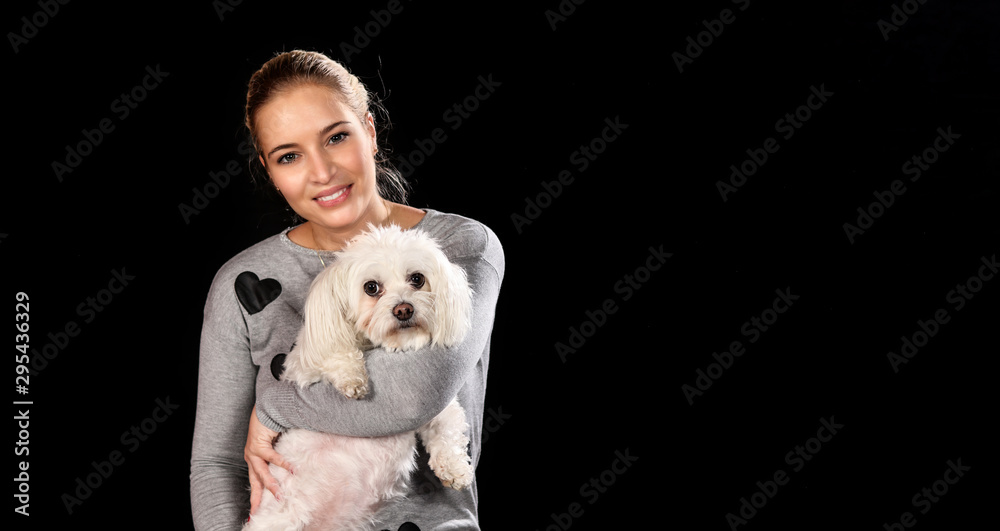 Woman with her best friend, her dog, posing for a portrait on black background.